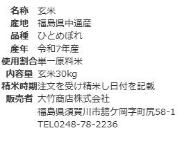 【新米予約】令和7年産 福島県中通産ひとめぼれ 玄米30kg(精米27kg)
